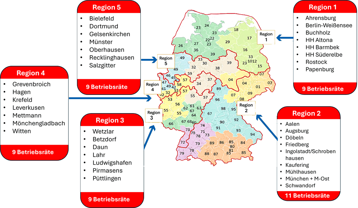 In vier Regionen werden jeweils neun Betriebsratsmitglieder gewählt, in Region 2 ein elfköpfiger Regionalbetriebsrat. Die Gremien vertreten jeweils zwischen 250 und 550 Beschäftigte und bringen deren Interessen auch in den Gesamtbetriebsrat ein.